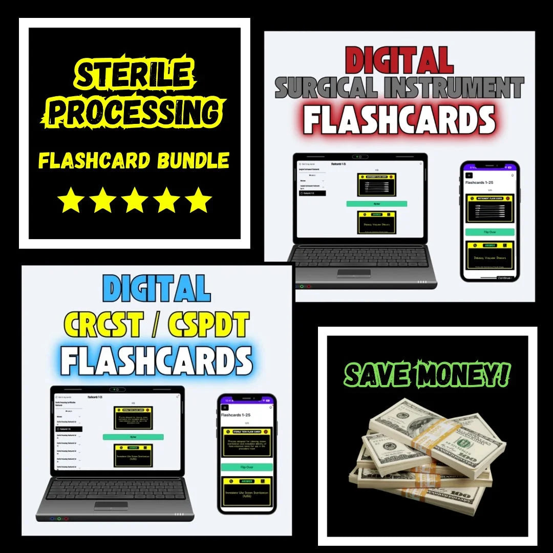 The Sterile Processing Flashcards Bundle contains two different products, the digital Sterile Processing Flashcards, and the digital Surgical Instrument Flashcards. Designed for the Certified Registered Central Service Technician (CRCST) certification from HSPA (Healthcare Sterile Processing Association. Sterile Processing Flashcards contain 200 flashcards having questions and critical definitions. The Surgical Instrument Flashcards contain 150 high quality digital flashcards with pictures of surgical instruments as well as their surgical specialties. Designed by The Sterile Guy to help you study and pass the CRCST certification exam.